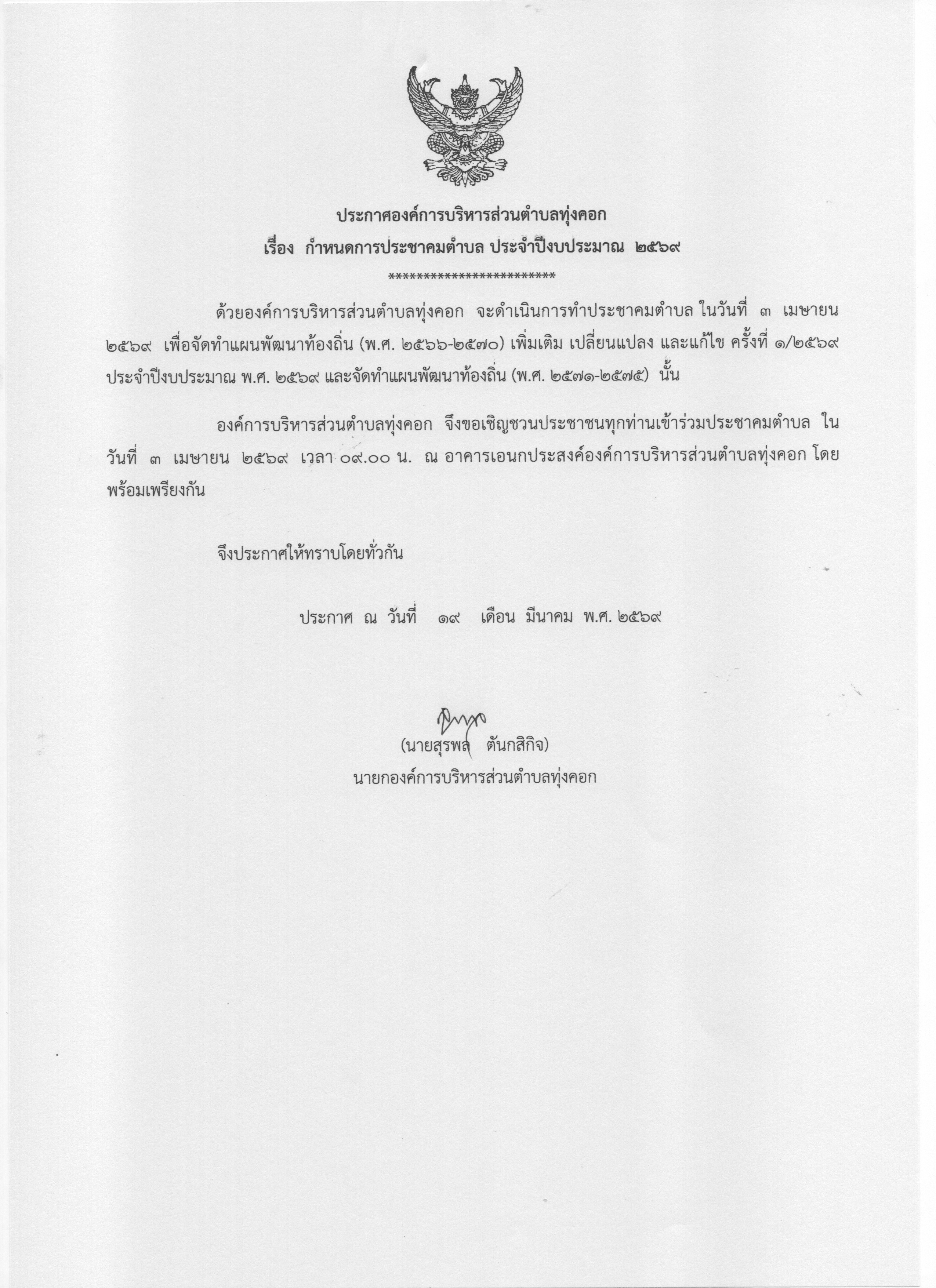 ประกาศ กำหนดการประชาคมตำบลทุ่งคอก ประจำปี พ.ศ. 2569