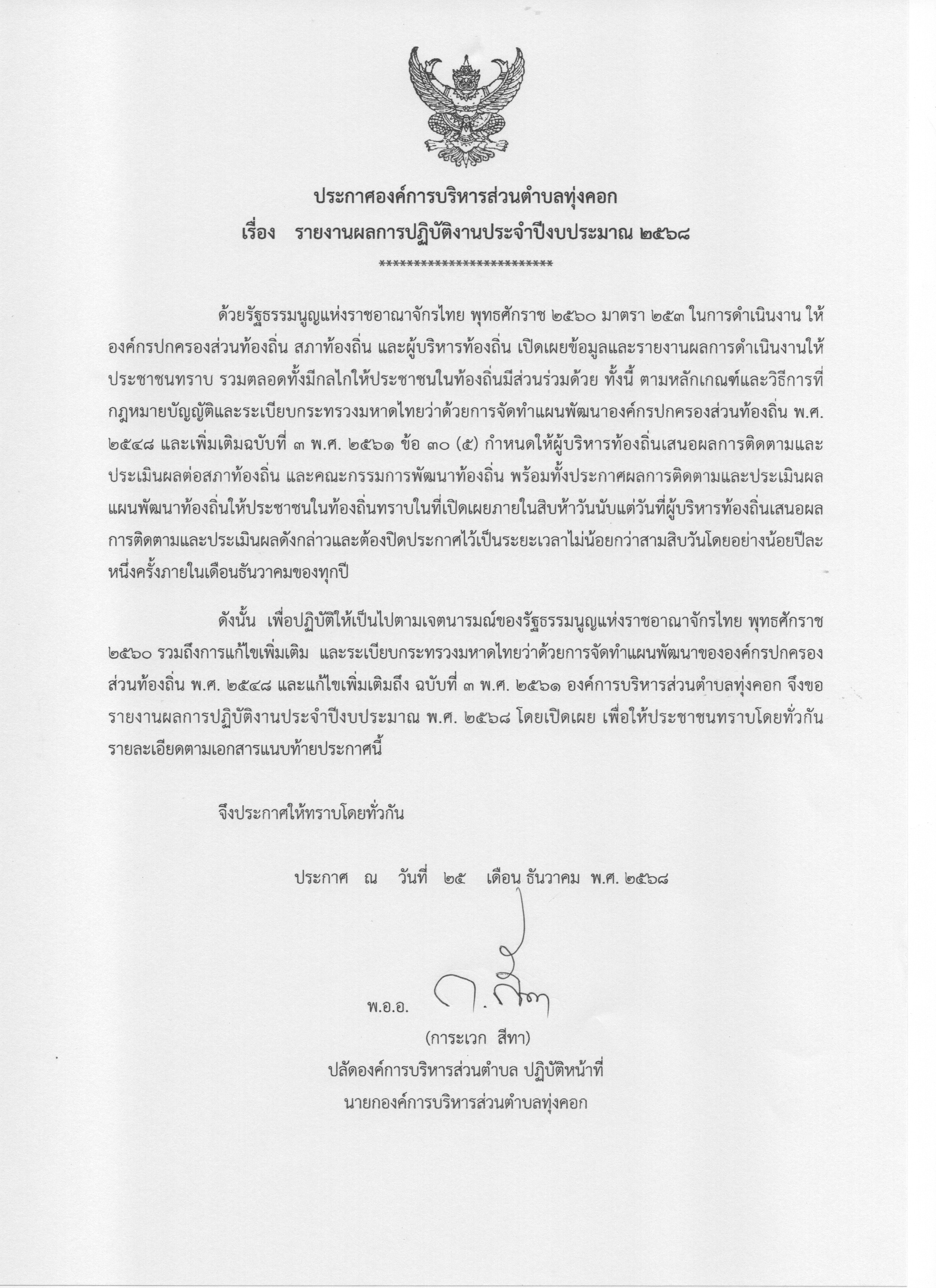 ประกาศ องค์การบริหารส่วนตำบลทุ่งคอก เรื่อง กำหนดการประชาคมตำบล ประจำปีงบประมาณ 2568 |